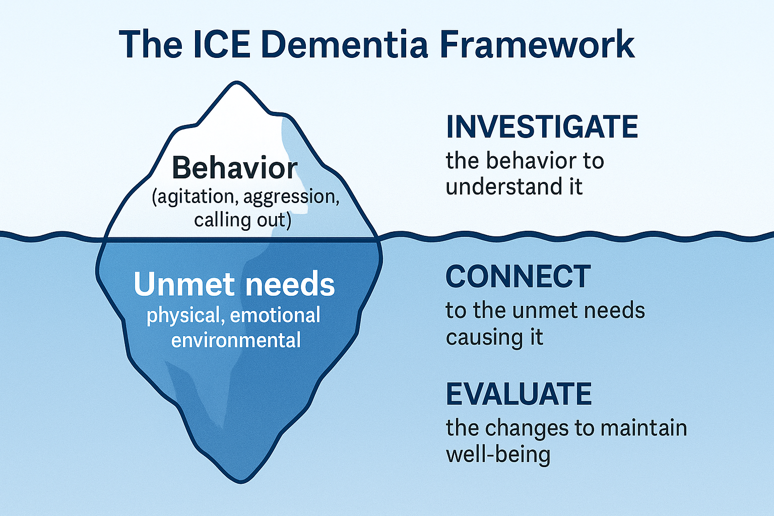 The ICE Dementia Framework teaches staff a simple, structured way to look beyond the behaviour and support the resident’s unmet needs: